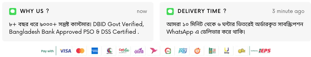 SubsBhai is a DBID government verified business in Bangladesh and uses EPS verified payment gateway (DSS & PSO certified) for secure transactions.