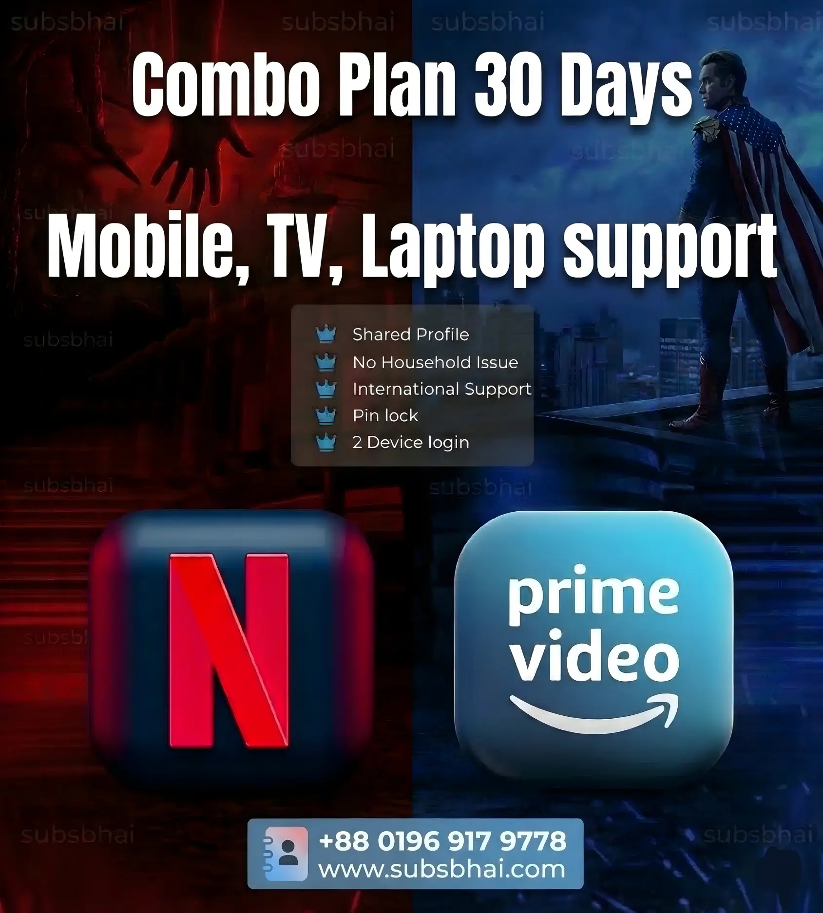 - Combo: Netflix + Prime Video (30 days)